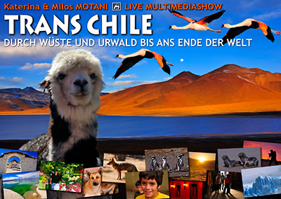 TRANS CHILE Durch Wüste und Urwald bis ans Ende der Welt Chile ist ein Land voller Extreme und hat von allem etwas: Wüste, Meer, Lagunen, Salzseen, Vulkane, Geysire, Kakteen, Palmen, Inseln, tiefe Urwälder, uralte Araukarien, Eisberge. In den Häfen pulsiert das Leben. Abgelegene Dörfer atmen selige Ruhe und Frieden. Verlassene Salpeterstädte und geheimnisvolle Geoglyphen sprechen von der Vergangenheit. Und ganz im Süden liegt Feuerland, das Ende der Welt. Katarina und Milos MOTANI brechen mit Ihnen in dieser Projektion nach Südamerika auf. In der ersten Etappe quer durch das nördliche CHILE bereisen sie mit Ihnen die trockenste Wüste der Welt, die ATACAMA, die sich zwischen der Pazifikküste und den hohen Anden ausbreitet. Katerina und Milos lassen auf ihrer Reise keineswegs pulsierende Häfen, abgelegene Dörfer oder verlassene SALPETERSTÄDTCHEN aus. In völliger Einöde grübeln sie über die Bedeutung von rätselhaften Geoglyphen. Sie erforschen eine entzückende Kakteenküstenwüste. Vom Hafen Arica steigen sie binnen weniger Stunden auf eine Höhe von 4 500 Metern über dem Meer - im Chile geht das sehr schnell. Drei Tage kämpfen beide mit der Höhenkrankheit. Unterwegs sehen sie eine Menge verschiedener Tiere - Seebären, ewig hungrige Pelikane, rosafarbene Flamingos, neugierige VIKUNJAS, freche Alpakas, majestätische Lamas und scheue Chinchillas. Im Herzen der Atacama-Wüste verbringen die Reisenden einige Tage. Sie bewundern herrliche dunkelblaue LAGUNEN, salzhaltige Seen, verschneite VULKANKEGELN, das ergreifende Tal des Mondes und die GEYSIRE El Tatio. Ihr Essen teilen sie mit streunenden Hunden. Und sie behaupten, wenn sich irgendwo die FÜCHSE gute Nacht sagen, so eben hier in Chile. In der zweiten Etappe ihrer Reise begeben sie sich von Santiago de Chile südwärts. Sie suchen prähistorische ARAUKARIEN. Einen ganzen Tag verbringen sie in einem Mapuche-Dorf. Drei Tage und drei Nächte fahren sie mit dem Schiff zwischen zahlreichen FJORDEN und öden unbewohnten Inseln. Im Süden wird gestreikt und kein Auto darf den Ort Puerto Natales verlassen. Katarina und Milos überlegen, wie sie sich aus dieser sehr unangenehmen Situation schnellst möglich befreien können. Im Park TORRES DEL PAINE warten auf sie nämlich imposante Granitfelsen, Gletscherseen, Wasserfälle und riesige Herden von Lamas und Guanacos. Danach begeben sie sich mit Ihnen nach Argentinien zum herrlichen tosenden GLETSCHER Perito Moreno. Dann kehren sie wieder in das Wind und Regen gepeitschte Chile zurück, um sich dort PINGUINE anzusehen, die Lebenslust der Einheimischen trotz des schlechten Wetters zu bewundern und irgendwo an der Magellanstraße schöne rostige Schiffswracks zu entdecken. Neben ihnen verfallen die Blechbauten der verlassenen Schaffarmen. Katerina und Milos erreichen auch ihr langersehntesTraumziel - sie betreten FEUERLAND. Die Entfernungen sind enorm, die Wege unwegsam, also bleibt ihnen schließlich nichts anderes übrig, als an die Rückkehr zu denken. Durch die unendliche argentinische Pampa fahren sie wieder nordwärts. Sie holpern Stunden um Stunden auf steinigen Wegen zu zwei außergewöhnlichen HÖHLEN. Ihr letzter Tag auf dem amerikanischen Kontinent ist unerwartet mit AUFREGENDEN und dramatischen Ereignissen aufgeladen. Das Meer ist seltsam unruhig. Und abends, am stürmischen Meer, erfahren Katerina und Milos noch, wie es ist, mit kleinen SEEBÄREN zu kuscheln ! Sehr bunte Foto&Video-Multimediashow der Autoren Katerina & Milos MOTANI - mit vielen lustigen und auch spannenden Geschichten, mit sehr vielen Videopassagen gespickt.