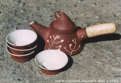 |  c45-1   Čajová souprava "S mořskou řasou" c45-1 čajová konvice a 4 misky Cena: 2.100,- Kč c45-2 dodatečná miska Cena: 125,- Kč | |