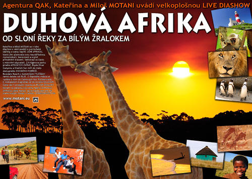 |    DUHOVÁ AFRIKA OD SLONÍ ŘEKY ZA BÍLÝM ŽRALOKEM Krásná, barevná, bohatá, chudá, romantická, ale dovede i polechtat nervy, srdečná i nebezpečná, divoká, vyprahlá i svěží, tváře hýří všemi barvami, zdobená neznámými rostlinami a se spoustou spoustou zvířat - taková je duhová Jižní Afrika. Ve své nejnovější diashow se Kateřina a Miloš MOTANI s vámi podělí o své bohaté zážitky a poznatky z cesty napříč JIŽNÍ AFRIKOU, která jim učarovala svou neuvěřitelnou různorodostí, barevností a svými přírodními krásami. Úplně poprvé se objeví v jejich pásmu kromě nádherných fotografií i krátké videosekvence. Podkreslující podmanivá etnická hudba a procítěný komentář vtáhne každého diváka do dění, jakoby byl on sám na cestě. Uprostřed buše plné AFRICKÝCH ZVÍŘAT objevují oba fotografové a cestovatelé také plno neznámých rostlin. K nezapomenutelným patří i nesčetná setkání s místními obyvateli. Z nebezpečného Johannesburgu vede jejich cesta do Blyde River Canyonu a Krügerova parku. Od SLONÍ ŘEKY míří do Dračích hor - s výskytem těch nejstarších sánských jeskynních maleb. DIVOKÉ POBŘEŽÍ je uchvátí nejen svou nedostupností, nádhernou krajinou a dramatickým pohledem na moře, ale i původními barevnými hliněnými chýšemi, ve kterých stále tepe život, jako kdysi zastara. Od Kapského města a krajiny směrem k Mysu dobré naděje se nemohou dlouho odtrhnout. Stále je se na co dívat a nad čím žasnout. A Boulders Beach s roztomilými TUČŇÁKY nemá daleko od RÁJE. Kateřina s Milošem se poté vydávají do rozeklaných Cedrových hor, které na druhý den zachvátí zničující požár. Kolem západního pobřeží s ohromnou kolonií terejů pokračují do pustého Richtersveld, k vodopádům Augrabies - až do pouště KALAHARI. Po celou svou cestu zažívají další krásné, romantické, úsměvné i napjaté chvíle. Vyplouvají i na volné moře. Velryby v tuto dobu jihoafrické vody již opustily, ale BÍLÍ ŽRALOCI krouží okolo pobřeží po celý rok. Šance, že se podaří nějakého zahlédnout, je veliká. Motani na začátku své vysněné, celkem dvouměsíční cesty ještě netuší, že se každý den pro ně stane malým (někdy i větším) DOBRODRUŽSTVÍM. V DUHOVÉ AFRICE žije duhový národ, vyvěšuje se duhová státní vlajka, u duhového vodopádu pobíhají duhové ještěrky, diamanty mají duhový lesk a letní bouřkovou oblohu zdobí - co jiného než DUHA. PESTRÉ PÁSMO S PRVNÍMI VIDEOSEKVENCEMI Velmi úspěšná a pestrá fotografická projekce Kateřiny a Miloše MOTANI okořeněná špetkou dobrodružství, poprvé s krátkými videosekvencemi. Byl vydán nástěnný KALENDÁŘ "DUHOVÁ AFRIKA 2010".